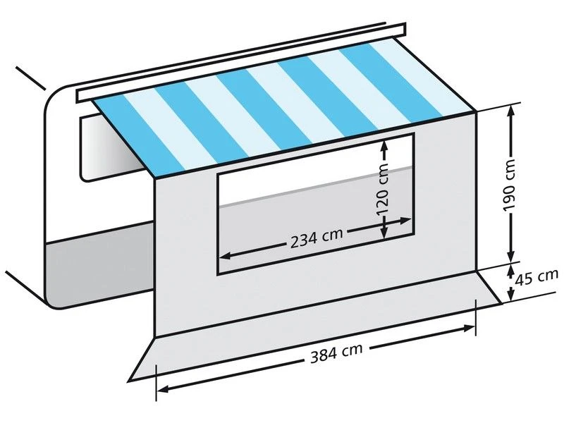 Eenvoudige bevestiging dmv de aangestikte pees in het profiel aan de onderzijde van de cassette luifel te schuiven. Kleur grijs. Incl. afspanladders, haringen en opbergtas