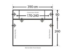Vrijstaande tent, breedte 390 cm. Hoogte 220-300 cm.