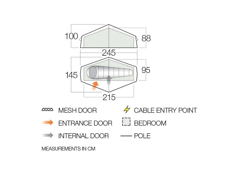 Gepatenteerd Vango TBS® – Tension Band systeem zorgt dat de tent blijft staan bij harde wind. De banden ondersteunen de stokken op 3 plaatsen en voorkomen zijwaartse beweging. Span niet strakker af dan nodig, omdat de stokken anders kromtrekken. Kan bij rustig weer worden opgeborgen.